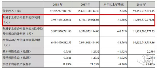 2018年年报显示,当年归属于上市公司股东的净利润同比下降41.38%,由2017年的约67.51亿元下降至约39.57亿元。而2016年,这个数字还有百亿之巨。
