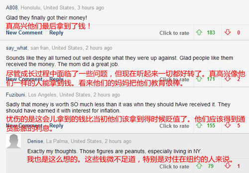 这笔赔偿金本该早早拨付给遇难者的儿子们,然而法院指定的监护人在2005年要求将这笔钱用作他们的教育储蓄。但是赔偿金迟迟未打进他们的户头。据报道,随着3个孩子一天天的长大,法院的工作人员一直未能通知他们这笔钱的存在。