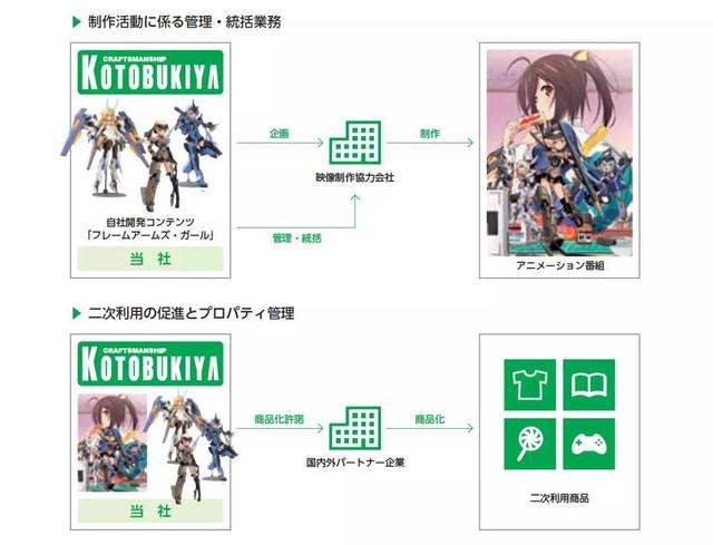 当然,除了向版权方购买版权以外,自己做IP也是十分必要的。就拿寿屋自家IP“机甲少女”(Frame Arms Girl)来说,寿屋在做玩具之余,还可以制作动画内容来增加粉丝,此外还能将版权授权给其他合作企业,让他们制作二次利用商品(如游戏、漫画、食品、杂货等)。