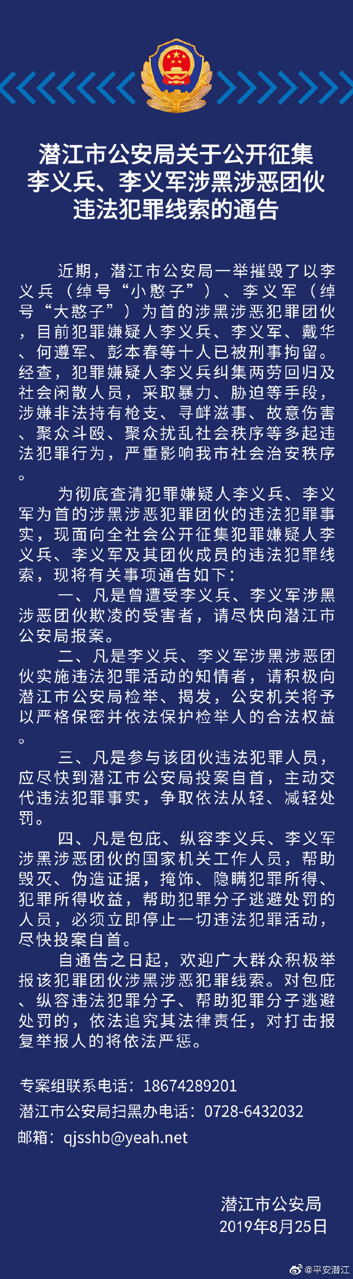为彻底查清犯罪嫌疑人李义兵、李义军,为首的涉黑涉恶犯罪团伙的违法犯罪事实,现面向全社会公开征集其团伙违法犯罪线索。