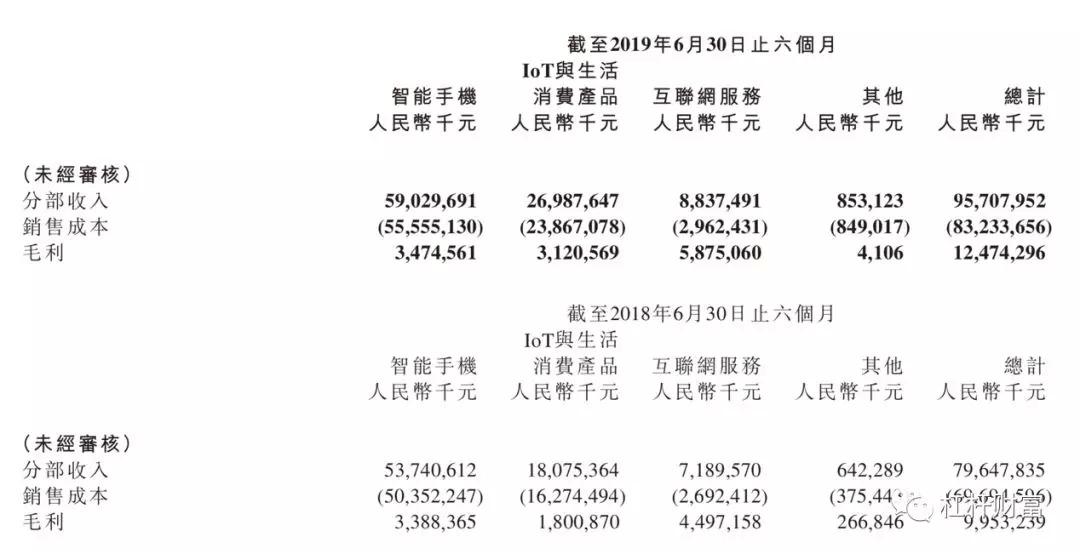 从半年报来看,智能手机仍是小米营收的重头,但在其三大业务中,也是智能手机的毛利率最低。