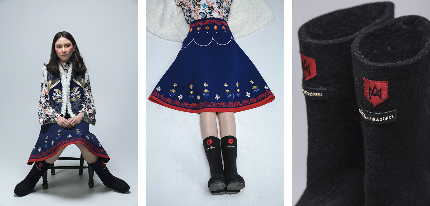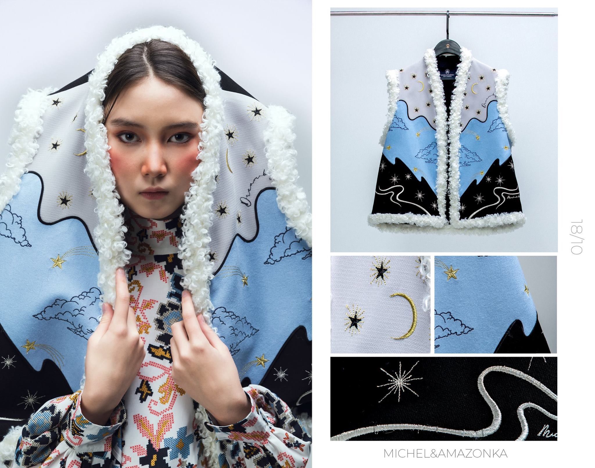 目前Michel & Amazonka有女装、男装、鞋履配饰和手袋,品牌将欧洲时尚风格与蒙古传统制衣工艺和装饰进行了结合,服装大量使用印花与民族刺绣,那些雪豹、星星、飞云的图案能让你很快察觉到蒙古文化的印记。