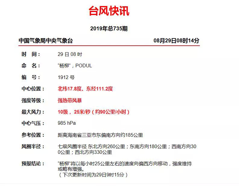 今年第12号台风“杨柳”(强热带风暴级)29日08时中心位于北纬17.8度、东经111.2度,也就是在海南省三亚市东偏南方约185公里的海面上,中心附近最大风力10级(25米/秒),中心最低气压为990百帕。预计,“杨柳”将以每小时25公里左右的速度向西偏北方向移动,强度缓慢增强,可能于今天下午到夜间在海南省陵水到三亚一带沿海登陆,也有可能掠过海南岛南部海面,然后趋向越南北部沿海。