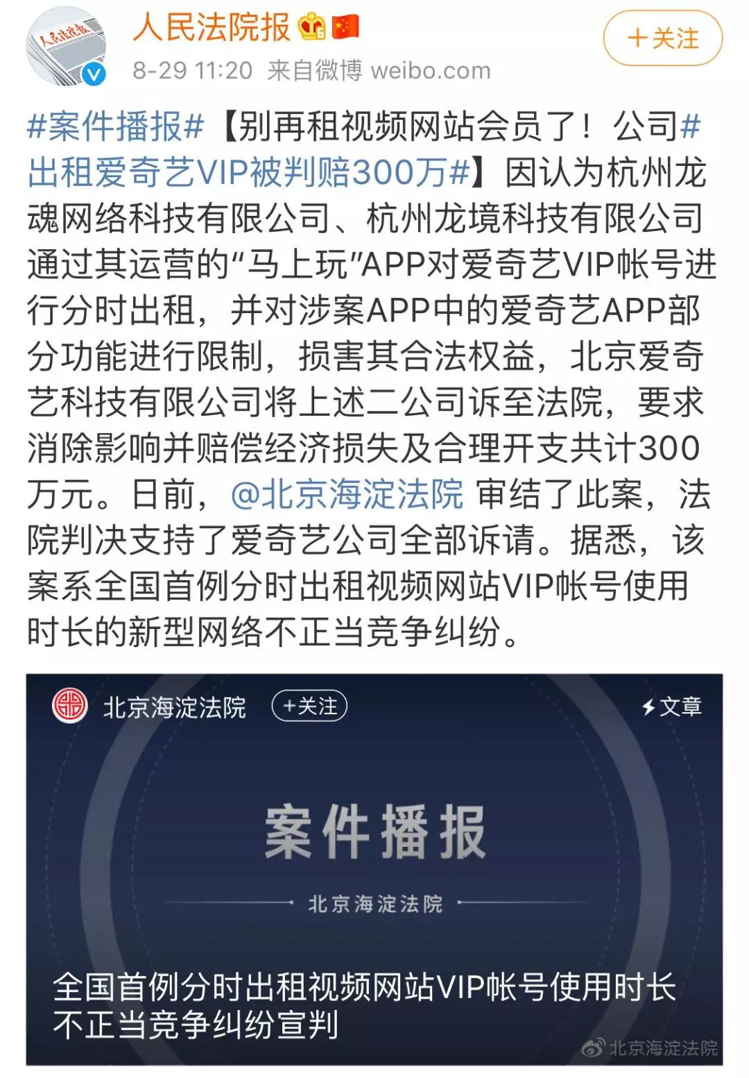 8月28日,“马上玩”APP对爱奇艺VIP帐号进行分时出租,并对爱奇艺App部分功能进行限制,破坏了爱奇艺公司基于“付费VIP会员”模式进行的正常经营行为,损害了爱奇艺公司的合法权益,构成不正当竞争,被判损赔偿爱奇艺300万。