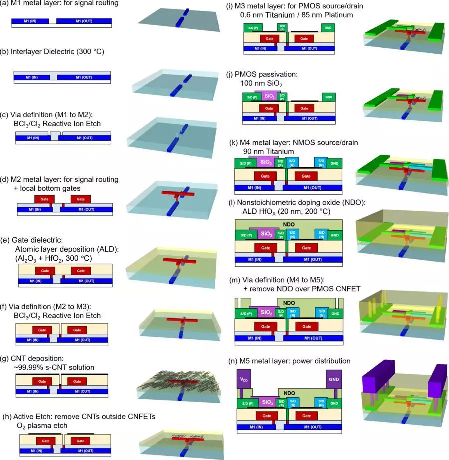 最后,研究者解决了 CNFET 上常见的功能性问题。二进制计算需要两种晶体管:「N」在 1 比特经过时打开,0 比特经过时关闭;「P」则正好相反。一般来说,制造这两种碳纳米管是有挑战性的,得到的晶体管性能有好有坏。为了解决这个问题,研究者开发了一种名为 MIXED 的技术,即「金属表面工程与静电掺杂交叉」,可以精准地调整、优化晶体管的功能。