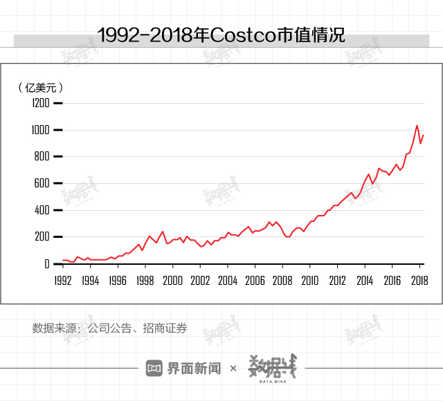 自1986年上市以来,Costco股价一路攀升,截至美国东部时间2019年8月29日16时,Costco市值达到1304.28亿美元。