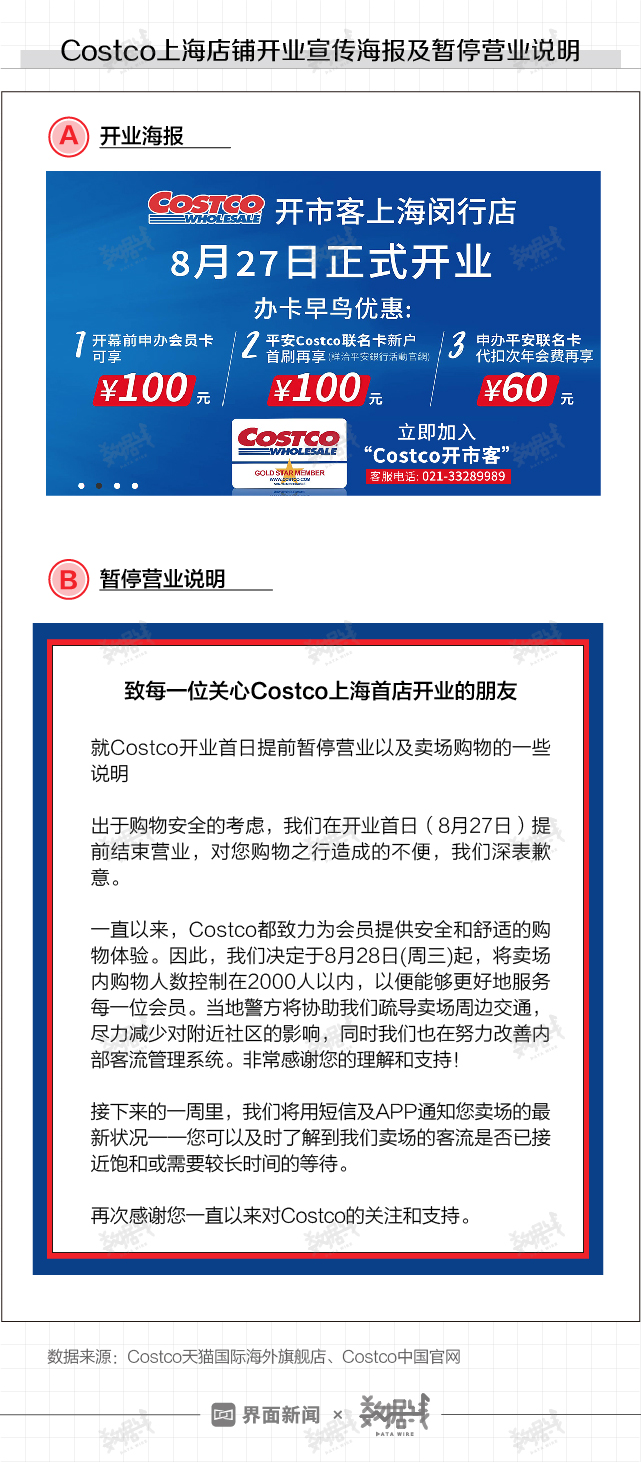 截至目前,Costco天猫国际海外旗舰店和天猫旗舰店官网上明确列有上海闵行店开业宣传海报。同时,上海闵行店开业首日提前暂停营业的说明也悬挂于Costco中国官网的首页上。
