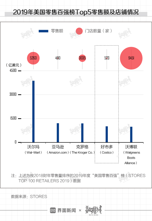 在杂志《STORES》评选出的2019年“美国零售百强榜”中,Costco以1014.3亿美元的零售额位居第四位,与第一名沃尔玛之间具有2862.3亿美元的差距。