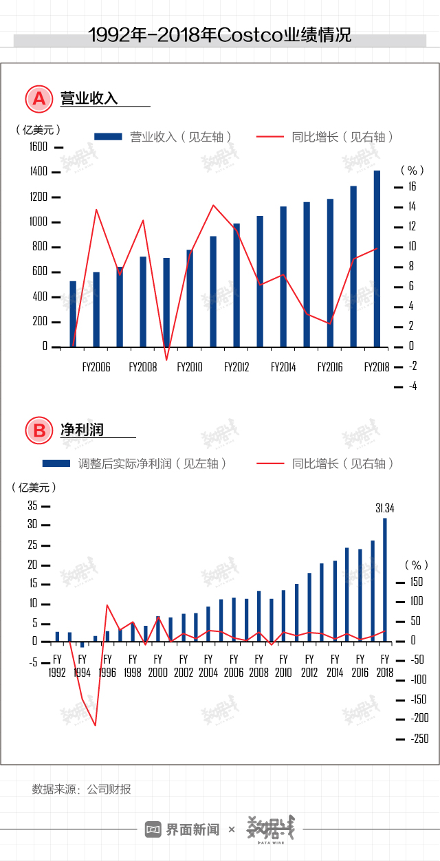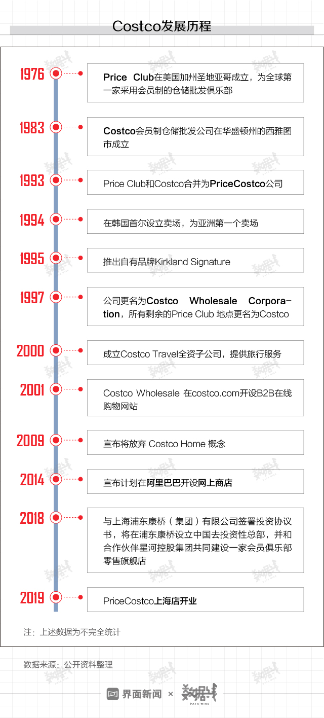 据界面数据(公众号ID:shujuxian_kuaikan)公开资料整理,起源于1976年的Costco,由Price Club和Costco两家公司合并而来。