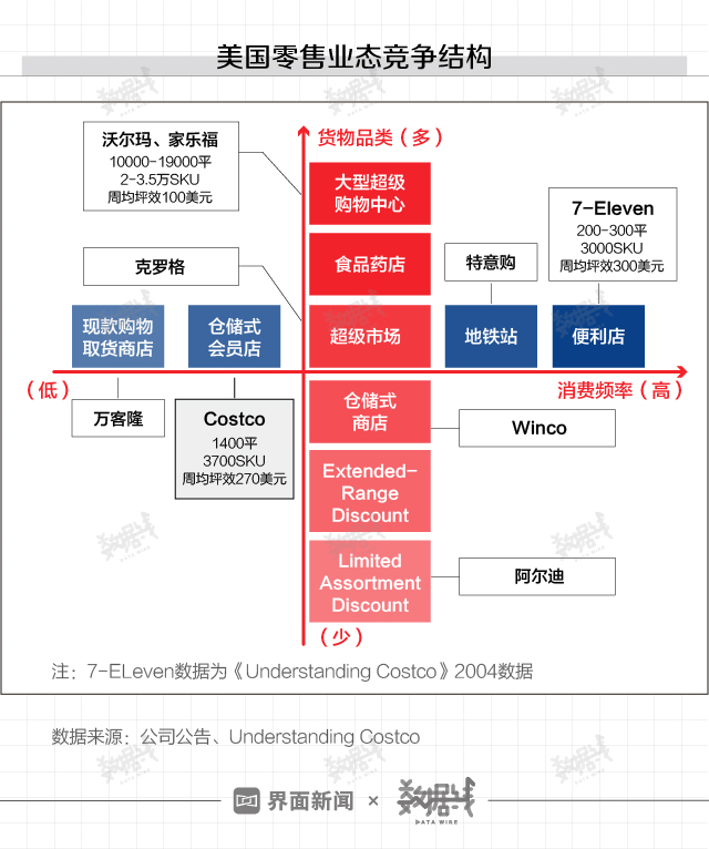 据《Understanding Costco》报告,从消费频率来看,Costco低于以7-Eleven为代表的便利店。同时,论货物品类,Costco不及以沃尔玛、家乐福为代表的大型超级购物中心。