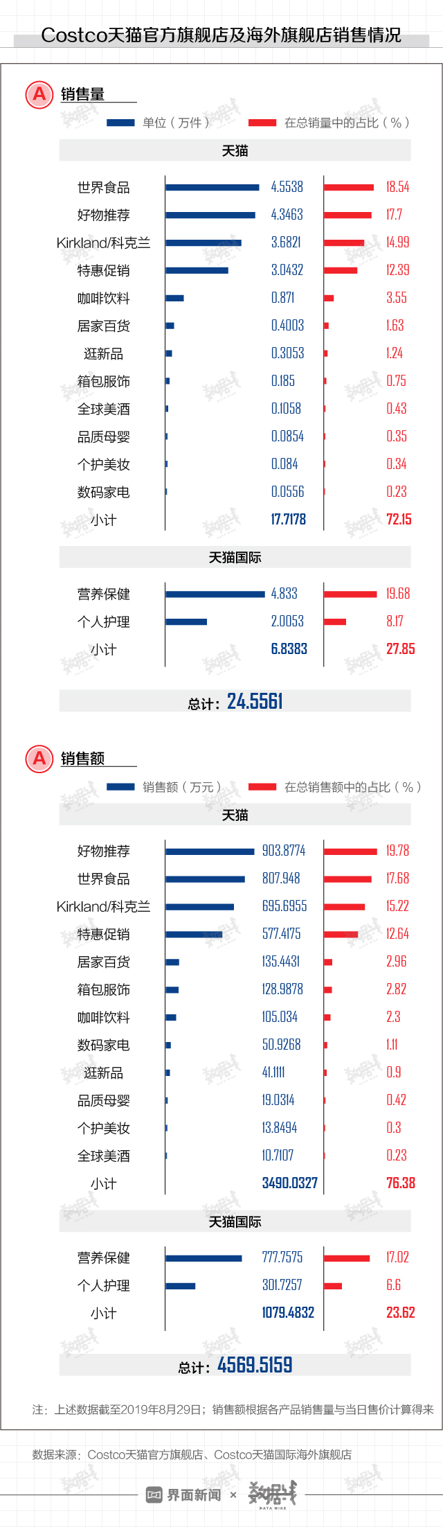 据界面数据(公众号ID:shujuxian_kuaikan)统计,截至2019年8月29日,Costco天猫旗舰店和天猫国际海外旗舰店253件商品,总销售量共计24.56万,如果根据各商品总销售量与官网当日售价来计算,销售金额共计4569.52万元人民币。