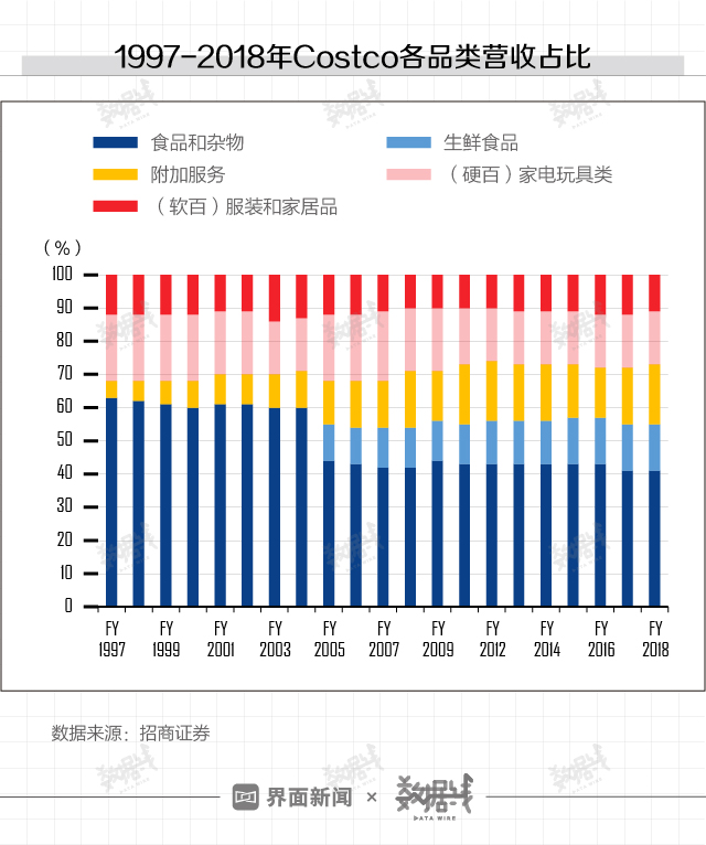 从Costco各品类营收情况来看,“食品和杂物”营收占比最高,2004年以前,该品类对公司营收的贡献超六成。