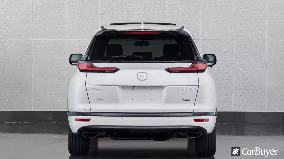 车的尾部设计则呈现出了一定的跨界效果,上半部分采用了亮黑色的装饰条包裹,尾灯比CR-V的尾灯要小很多,造型十分简洁。后备箱采用了分层风格的设计,底部同样也有黑色的装饰条,排气采用双边单出设计,尾喉采用了梯形设计。