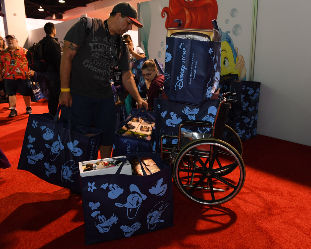 对迪士尼粉丝来说,此时的安纳海姆会议中心堪比圣殿,会场里几乎超过百分之九十的人,身上至少都有一两个跟迪士尼相关的产品,衣服、徽章、帽子、背包……米奇帽子可以搭配星战T恤,一套银河护卫队的徽章可以别在玩具总动员的包上。如果在身上别了一套稀有徽章,还会专门有粉丝前来“高价”咨询。