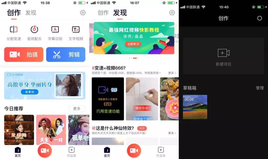 从左到右分别是快影首页、快影发现页和剪映的首页