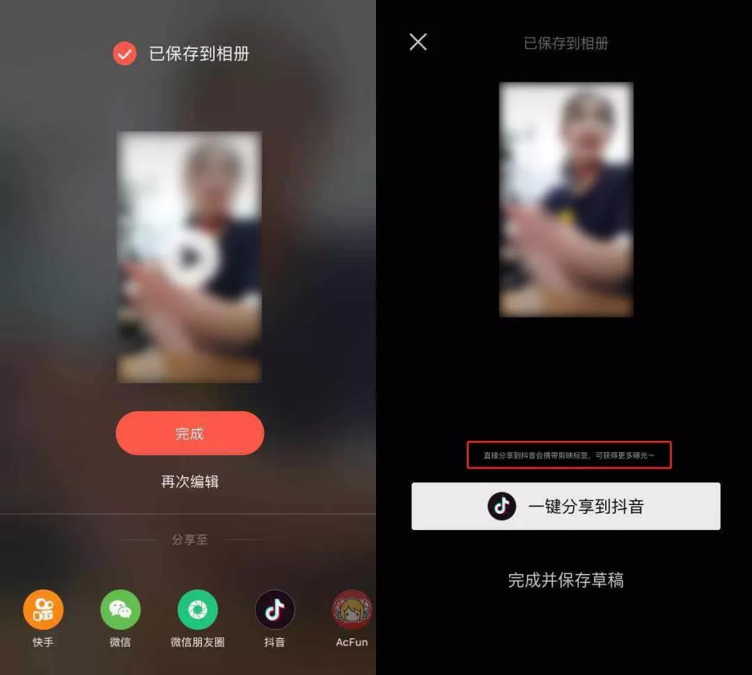 从左到右分别是快影和剪映的分享界面