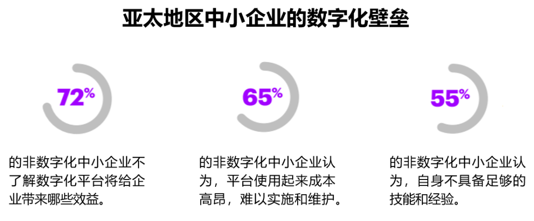 虽然消费者对线上平台也抱有极高热情,但是68%的受访亚太区中小企业并不打算增加对销售、营销、客户服务或电子商务等领域的数字化投入,其中甚至又有约1/6表示要减少在这些领域的数字化支出。