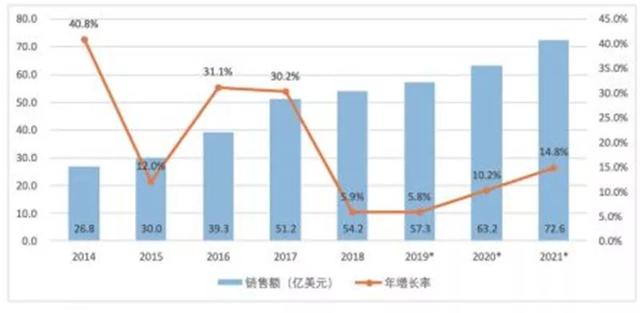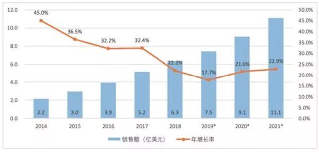 ▲ 2014-2021 年全球特种机器人销售额及增长率