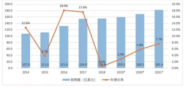 ▲ 2014-2021 年全球工业机器人销售额及增长率