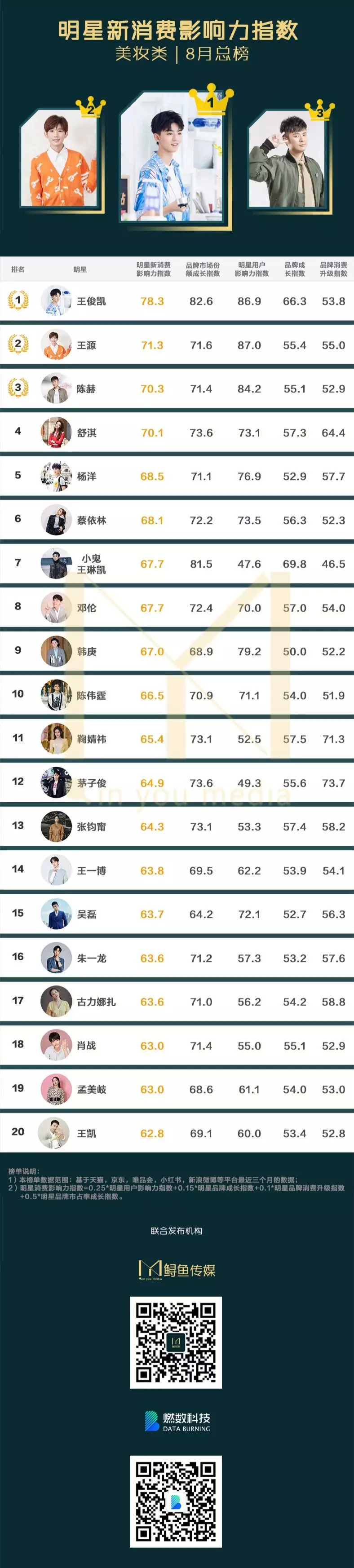 另外,陈赫、韩庚和茅子俊在榜单上的表现归功于他们热门影视作品的助力。