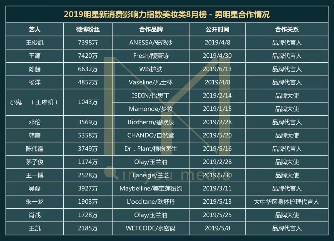 前二十名的2019年新代言人,男明星占据了14个席位,并且多数为偶像艺人,前两位分别是王俊凯和王源,TFBOYS霸占前两位,而没有进榜的易烊千玺,则是因为2019年还未与新的美妆类品牌产生合作关系。