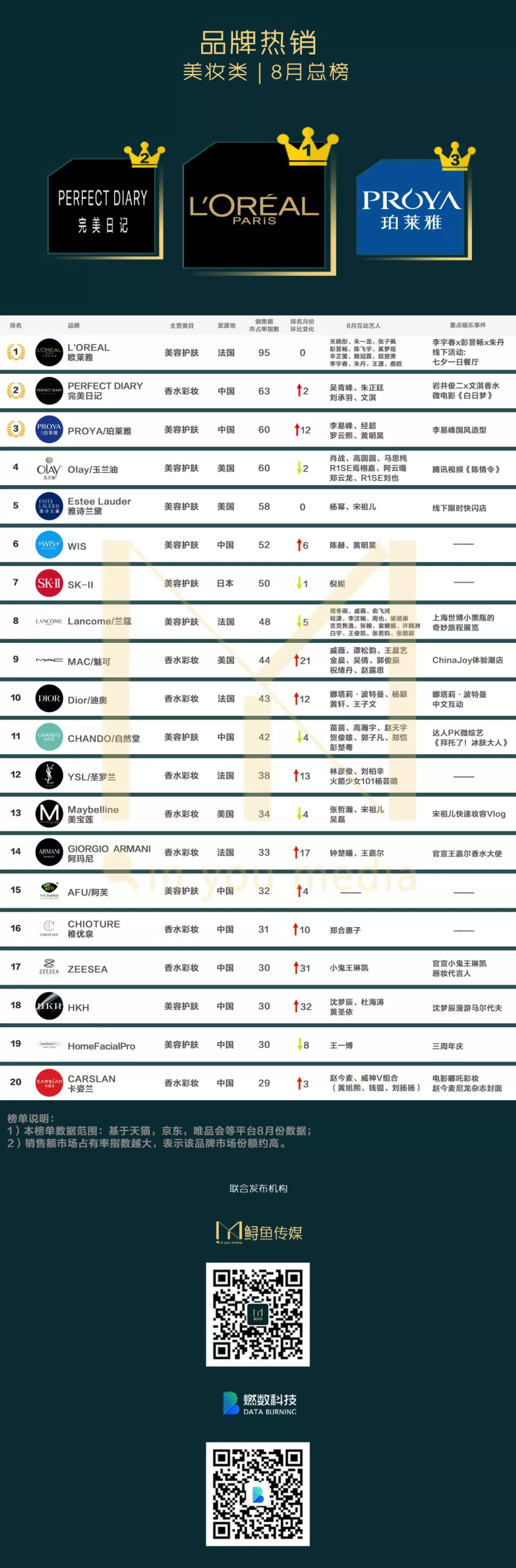 美妆类品牌方该如何评判一个明星的价值所在呢?而重塑市场交易后,一个明星的核心商业如何鉴定?品牌方又该通过怎样的有效途径与明星发生勾连,从而促进明星影响力带动销量?2019明星新消费影响力榜·美妆类8月榜发布,从现在开始,周、月、季度、年度榜单带各位鉴定明星的真正带货力。