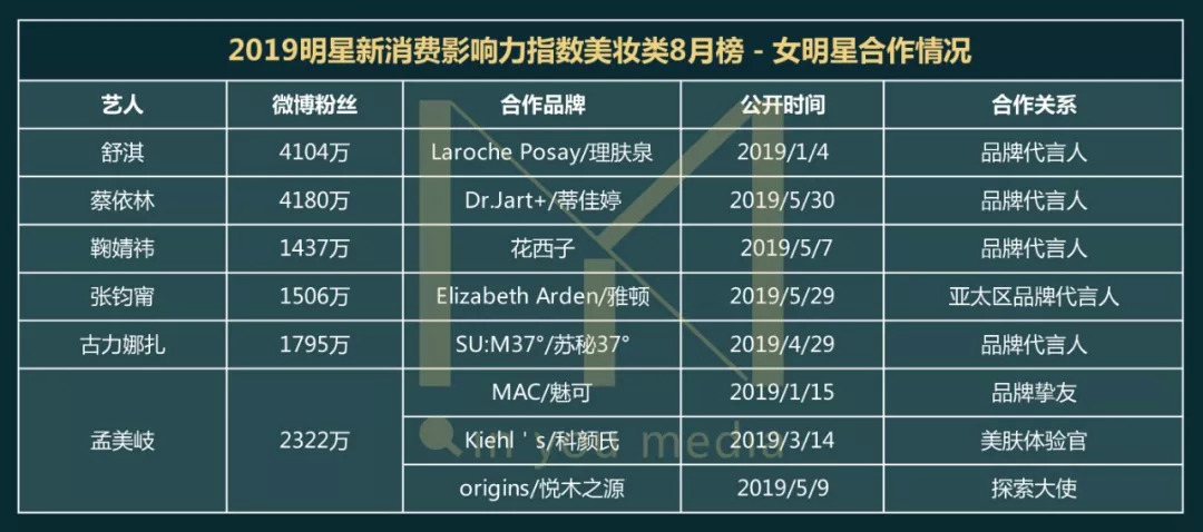 以火箭少女101 C位出道的孟美岐虽成团半年,但也在2019年新拿下三个合作关系,也印证了美妆品牌对于能发挥饭圈效应的流量偶像艺人强需求。