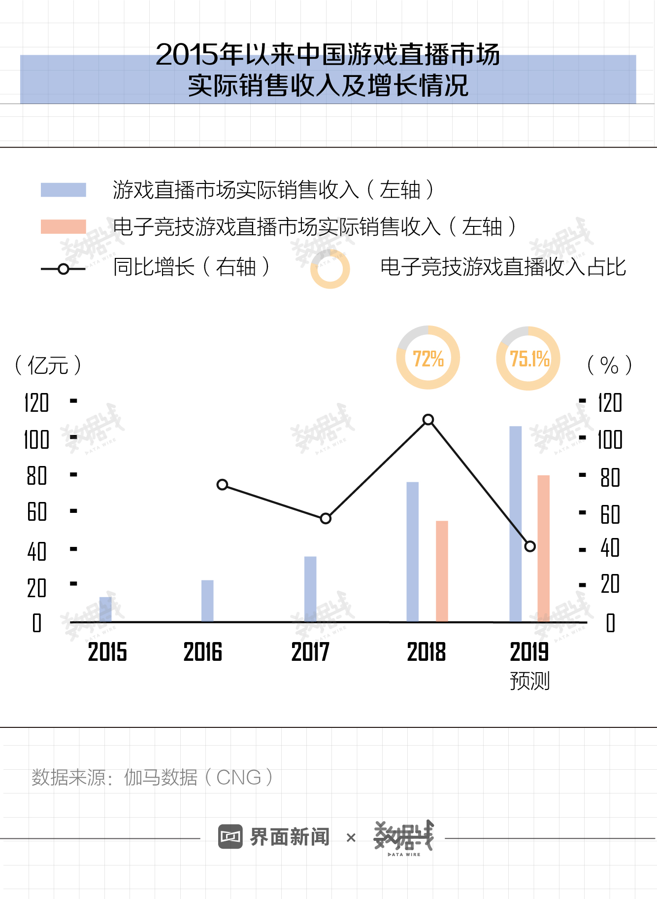 据伽马数据,2015年以来中国游戏直播市场收入保持高速增长,2019年预测收入达105.8亿元,较2015年翻了7倍。其中,电子竞技游戏直播是收入的主要组成部分,2018年占比达72%。伽马数据预测,2019年电子竞技游戏直播的收入将达79.5亿元,占比将进一步提升至75.1%。