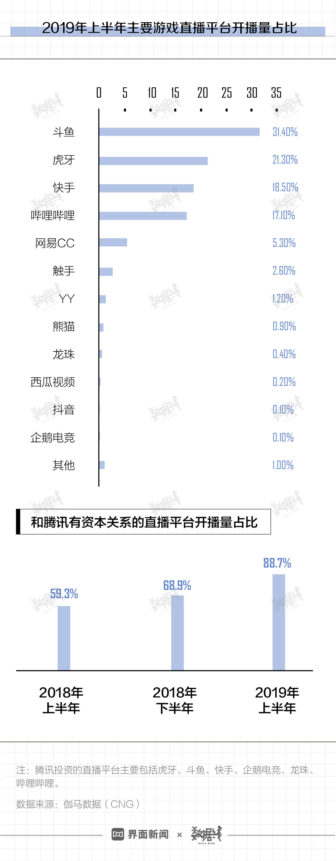 伽马数据显示,2019年上半年,和腾讯有资本关系的游戏直播平台开播量占比达88.7%
