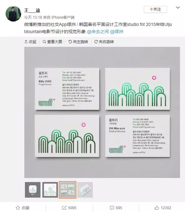 抄袭的质疑不止于此,9月4日下午,网友扒出绿洲Logo与韩国平面设计工作室studio fnt 2015年给Ulju Mountain电影节设计的视觉形象相似度颇高。经王高飞确认后,绿洲暂时下架。