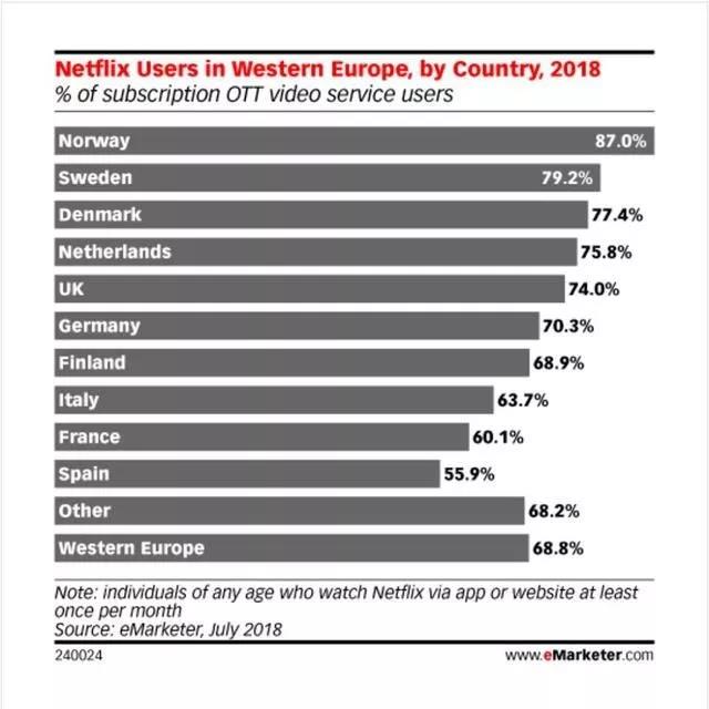 如果把格局放到全球来看的话,Netflix当然还有增长空间,并且增长空间巨大。据数据机构预测,2021年,全球流媒体市场规模将从2016年的300亿美元上涨至700亿美元。而Netflix目前在海外市场的优势较其他流媒体更大——eMarketer数据显示,Netflix在西欧各国流媒体付费用户数均占到了整个市场的半数以上,调查机构Digital TV Research于2018年发布的《撒哈拉以南非洲地区付费电视行业预测》的报告亦显示Netflix在中东和北非地区占据着主导地位。这一点也可以从Netflix全球付费用户的分布中看出:二季度Netflix全球总会员数为1.5亿,海外用户约为9000万,占据了付费用户大头。