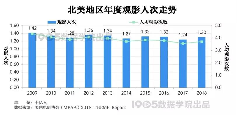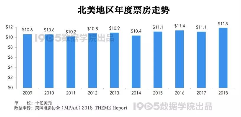 市场天花板近在眼前或是引发焦虑的原因之一。2018年美国电影协会报告显示,北美地区2018年观影人次为13亿,较上年增长5%,但与2009年的14.2亿人次相比却是下降了8.45%。其实自2009年以来,北美观影人次就基本稳定在13亿左右,年票房也在104亿到119亿美元之间波动,两项数据在十年间都相对稳定,渠道下沉对引入明显增量的作用不大。