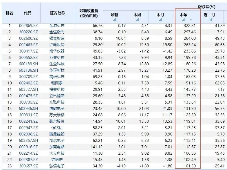 先看以金溢科技和沪电股份的电子元器件行业,可以看到这个行业今年以来翻倍的个股超过24个,涨幅超过200%的共五家公司:金溢科技、金运激光、领益智造、沪电股份和南华仪器,真的是谁买谁发财啊。