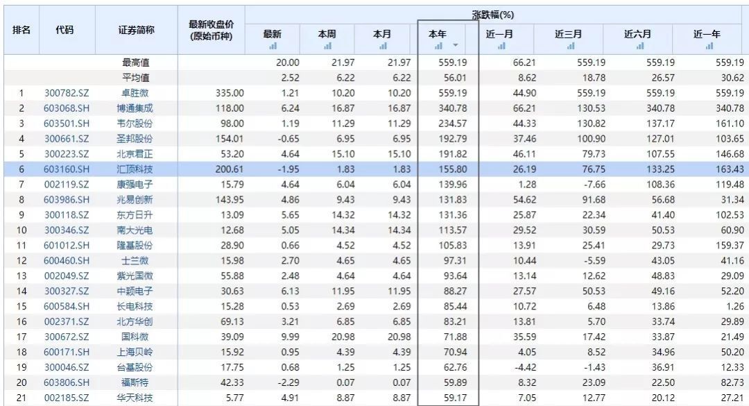 再看半导体行业,有11家公司翻倍,新股卓胜微、博通集成不谈,韦尔股份、圣邦股份、北京君正、汇顶科技、康强电子、兆易创新、隆基股份等等均已翻倍。