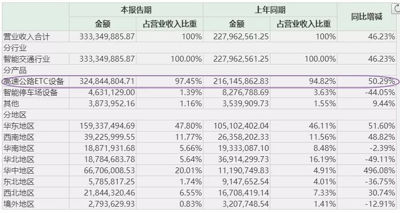 金溢科技上涨最根本的原因是上半年朋友圈长期刷屏的ETC,从下图可以看到金溢科技上半年营业收入中97.45%都是高速公路ETC设备销售收入。