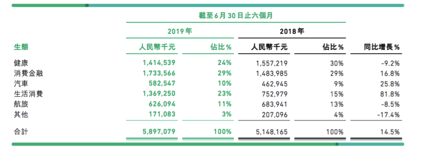 半年报显示,健康生态的核心产品“尊享E生”及支付宝好医保系列总保费上半年同比增长近50%,2019年上半年,健康总保费占公司总保费的比例仅此于消费板块,为24%。