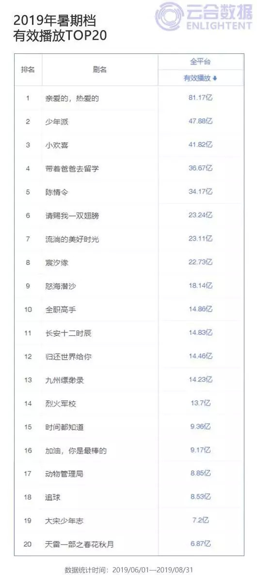 而综合云合数据有效播放量榜单来看,这其中诸如《亲爱的,热爱的》《少年派》《小欢喜》《陈情令》等又有极高的播放量,可谓收视、口碑双收之作。