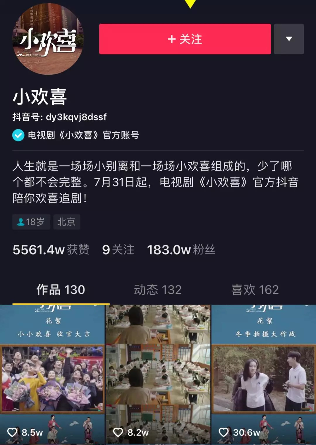 高口碑、高热度的《小欢喜》凭借5561.4万点赞数成为影视剧官抖总点赞量第一,单条视频最高播放量达到6311.8万,14个单条视频播放量超过100万,共登上28次抖音热搜。