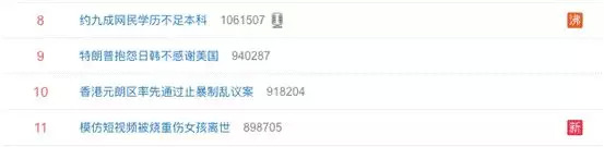 9月5日傍晚的微博同时上了两个相当不一样的的热搜,#约九成网民学历不足本科#、#模仿短视频被烧伤重伤女孩离世#。