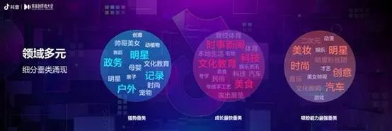 在8月24号抖音举办的创作者大会上,抖音官方宣布的数据显示,当前抖音有27个日均日均播放量超一亿的内容领域,主要垂类包括政务、户外、记录、明星,其中生活记录类内容占比高达21%。