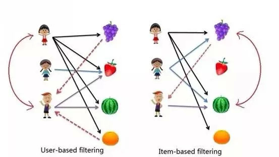 (协同过滤算法图解:左边是基于用户的算法,右边是基于物品的算法)