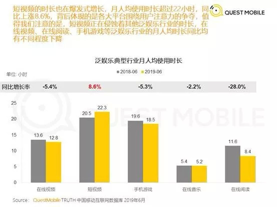 从整体文娱版图来看,短视频整体对于其余娱乐方式的争抢是成功的,据Questmobile数据显示短视频整体用户规模超8.2亿,同比增速超32%,10个互联网用户中有7.2个正在使用短视频产品。