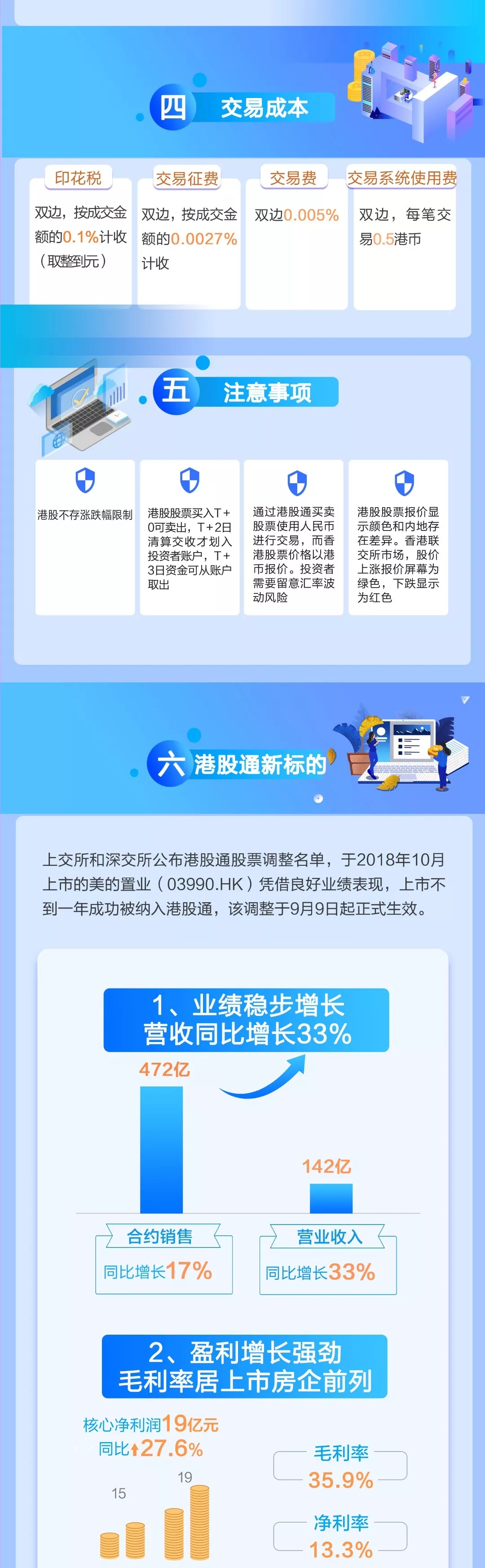 据港股通新一批调整名单官宣消息,今日,美的置业(03990, HK)被纳入港股通正式生效。根据9月8日上交所的公告,美的置业等9只股票被纳入沪港通;9月9日深交所公告,美的置业等22只股票被纳入深港通。此前8月16日,美的置业被纳入恒生综合指数大中型成份股。上市不到一年时间,美的置业便跻身恒生综指和港股通。