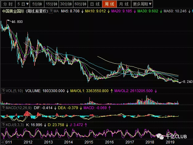 2011年9月,国际金价创下历史高位高达1922美元一盎司,其后一路走低直至2015年见底后在箱体运行,而中金国际同样在2011年初创出46.8元的历史高位后一路下行,直至2015年见底后在箱体运行,其股价走势与国际金价走势高度相关。