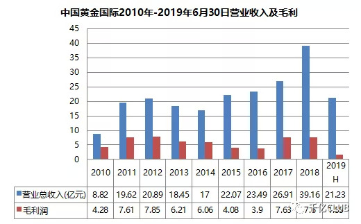 上市近9年以来,中国黄金国际营业额不断提升,从2010年的8.82亿元至2018年的39.16亿元增长3倍以上,不过毛利始终维持在10亿以下,其中2018年的营业收入39.16亿元为2011年19.62亿元的近2倍,毛利润却相当,这与持续下行的金价密切相关。