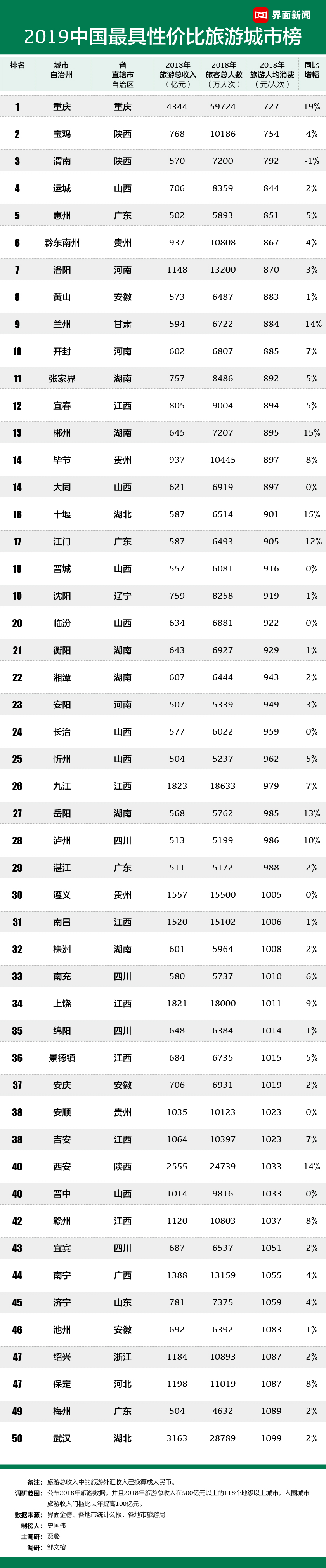 “七月在野,八月在宇,九月在户,十月蟋蟀入我床下。”处暑已过,天气也开始慢慢变得舒服自在起来。每个人的心里都装着自己的诗和远方,何不趁着十一黄金周出发?今年,界面在人均旅游消费榜单的基础上重新推出2019中国最具性价比旅游城市榜,也为您的出行选择提供了多一份的参考。
