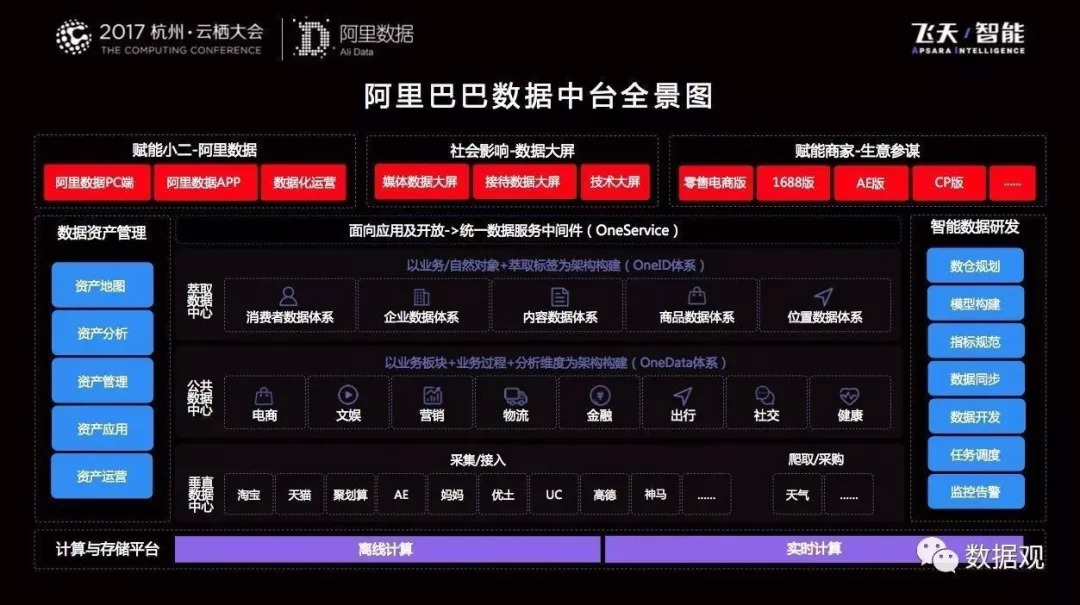 阿里曾在多份公开发表的文件中表示,建设阿里巴巴数据中台,打通各APP的用户数据。比如,从2017年杭州云栖大会上阿里巴巴数据技术及产品部高级技术专家张磊发表的主题为《阿里巴巴全域数据建设》的演讲资料可以看出,阿里巴巴当时就已经打通了包括电商、文娱、营销、物流、金融、出行、社交和健康等领域的用户大数据。