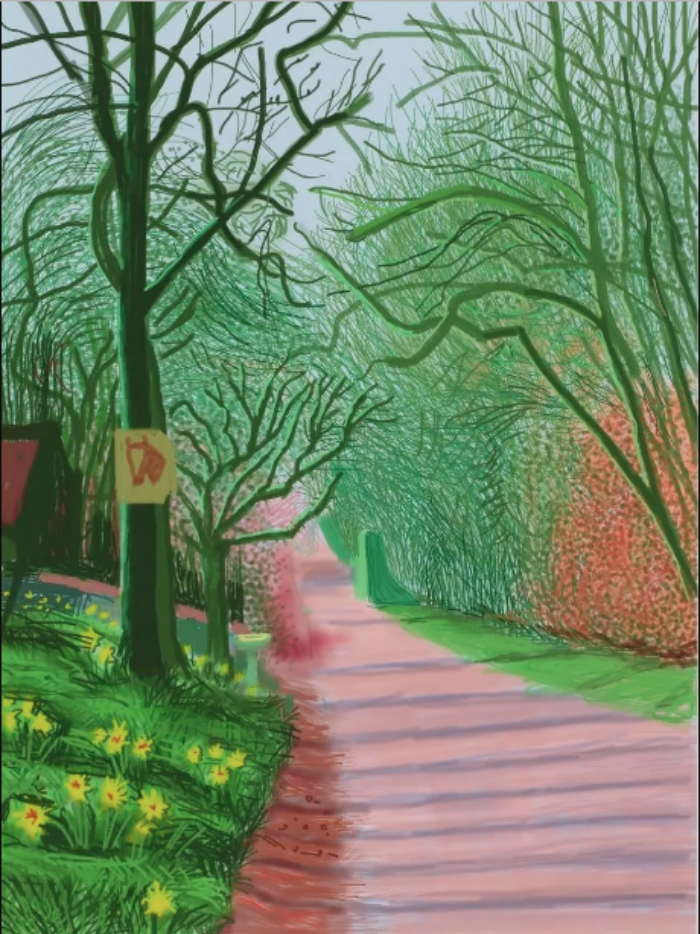 在展览的最后,呈现的是霍克尼今年持续创作的ipad绘画。霍克尼说,iPad 作画的好处,除了可以记录下整个作画过程,使之变成一场绘画表演以外,还在于 iPad 这张“纸”可以无限调节大小,只要两个手指开合,就可放大“纸张”,不停添加细节。
