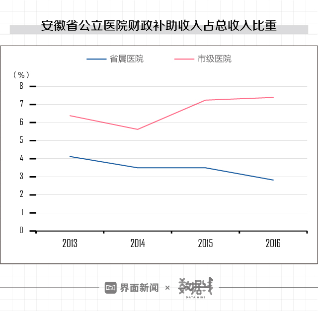 界面新闻查阅到的多篇文献显示,中国财政补助占公立医疗机构收入的比重在10%以下。 根据《安徽省属公立医院补偿机制研究》的数据显示,安徽省省属医院的财政补助收入占医院总收入比重逐年下降;市级医院的财政收入占比则有所上升, 但依旧在10%以下。