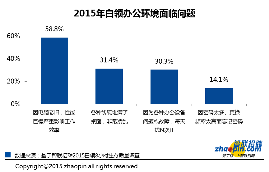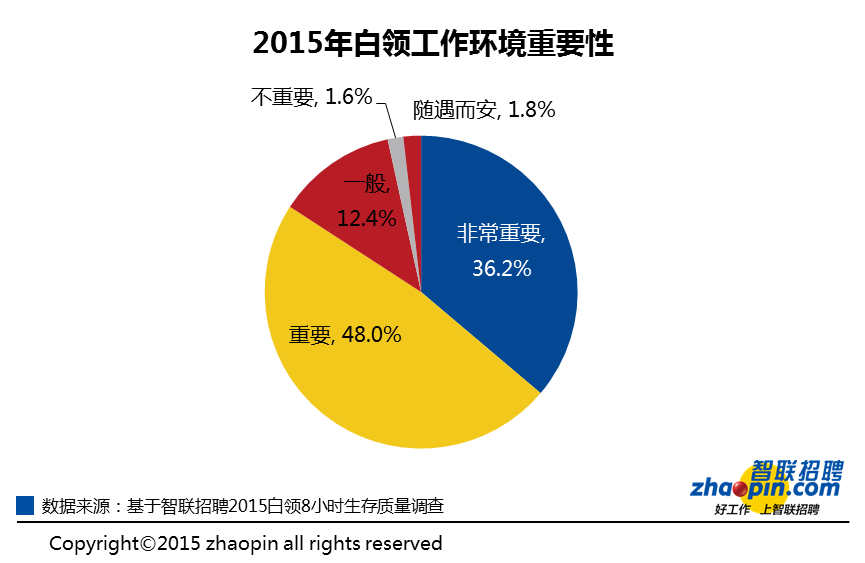 为了更好地了解白领们在工作时间的生存状况,智联招聘发起了一场“2015年白领8小时生存质量调查”,面向职场白领分别从工作环境、办公体验、加班情况等方面进行了调查,共收回13400份有效问卷,并在此基础上生成了《智联招聘2015年白领8小时生存质量调研报告》(以下简称《报告》)。